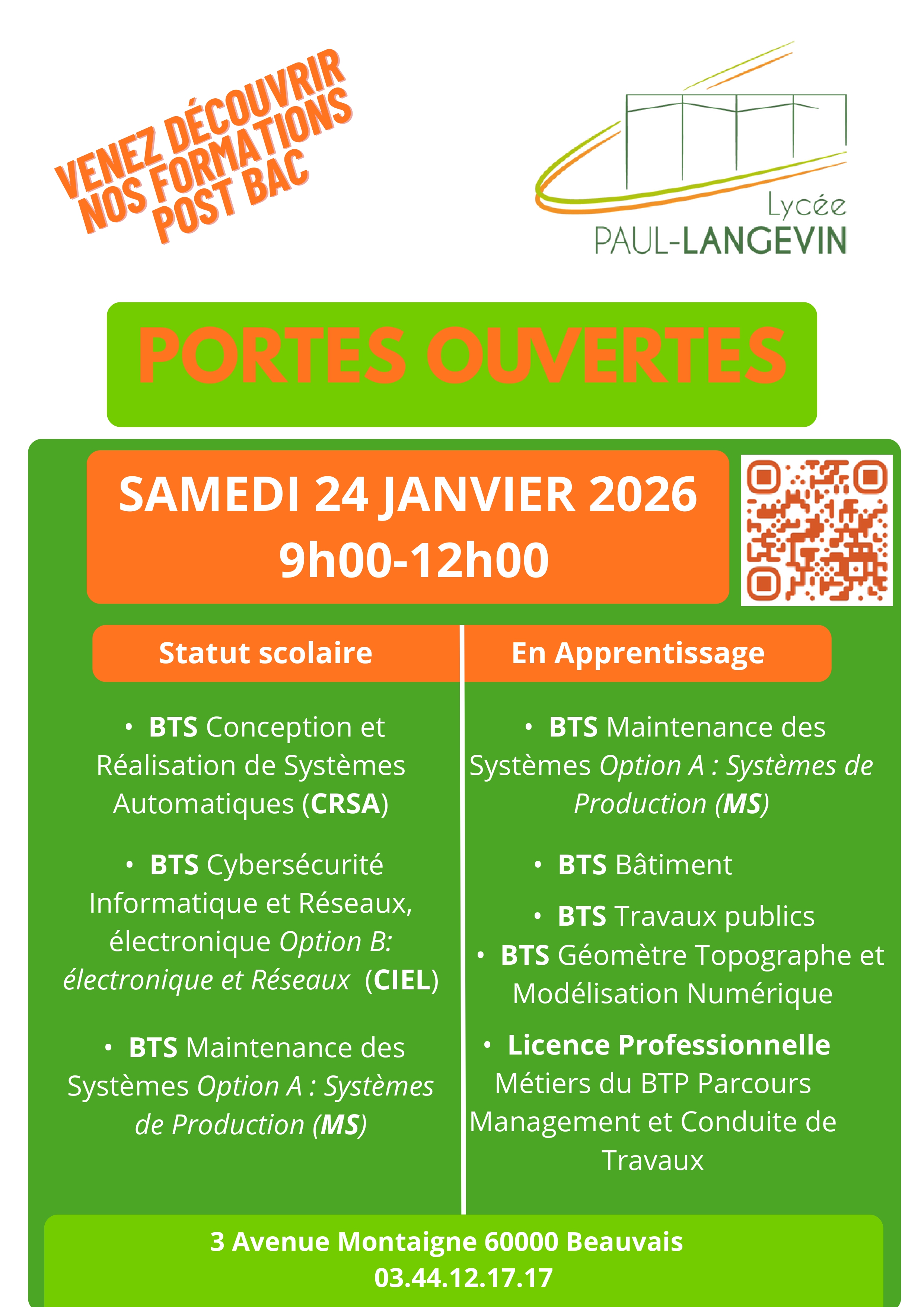 Venez retrouver l'ensemble de nos formations de BTS à l'occasion des portes ouvertes ce samedi 24 janvier 2026 de 9h à 12h.