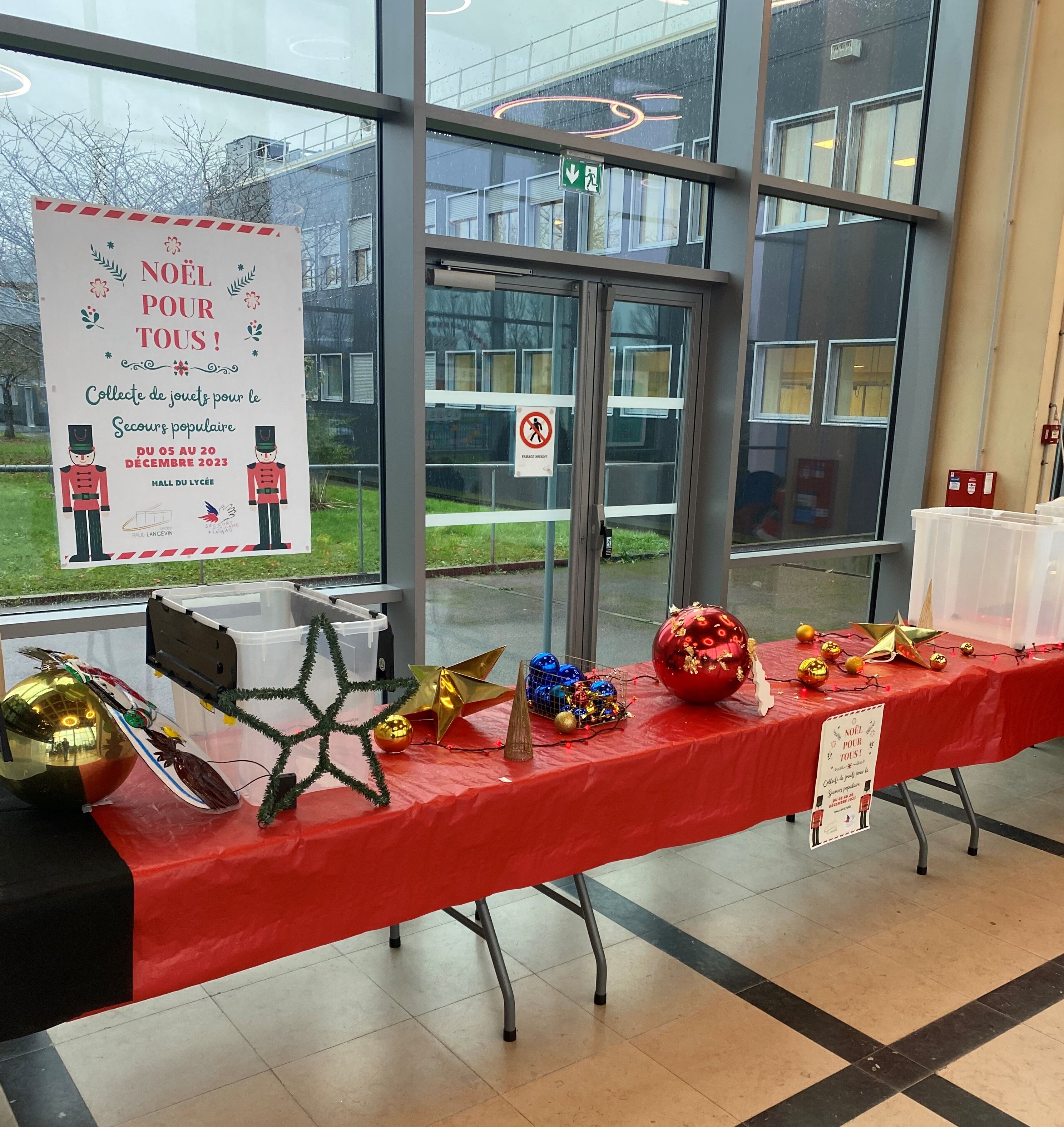 Le lycée Paul Langevin et les membres du CVL organisent une collecte de jouets en partenariat avec le Secours Populaire dans le hall du lycée.